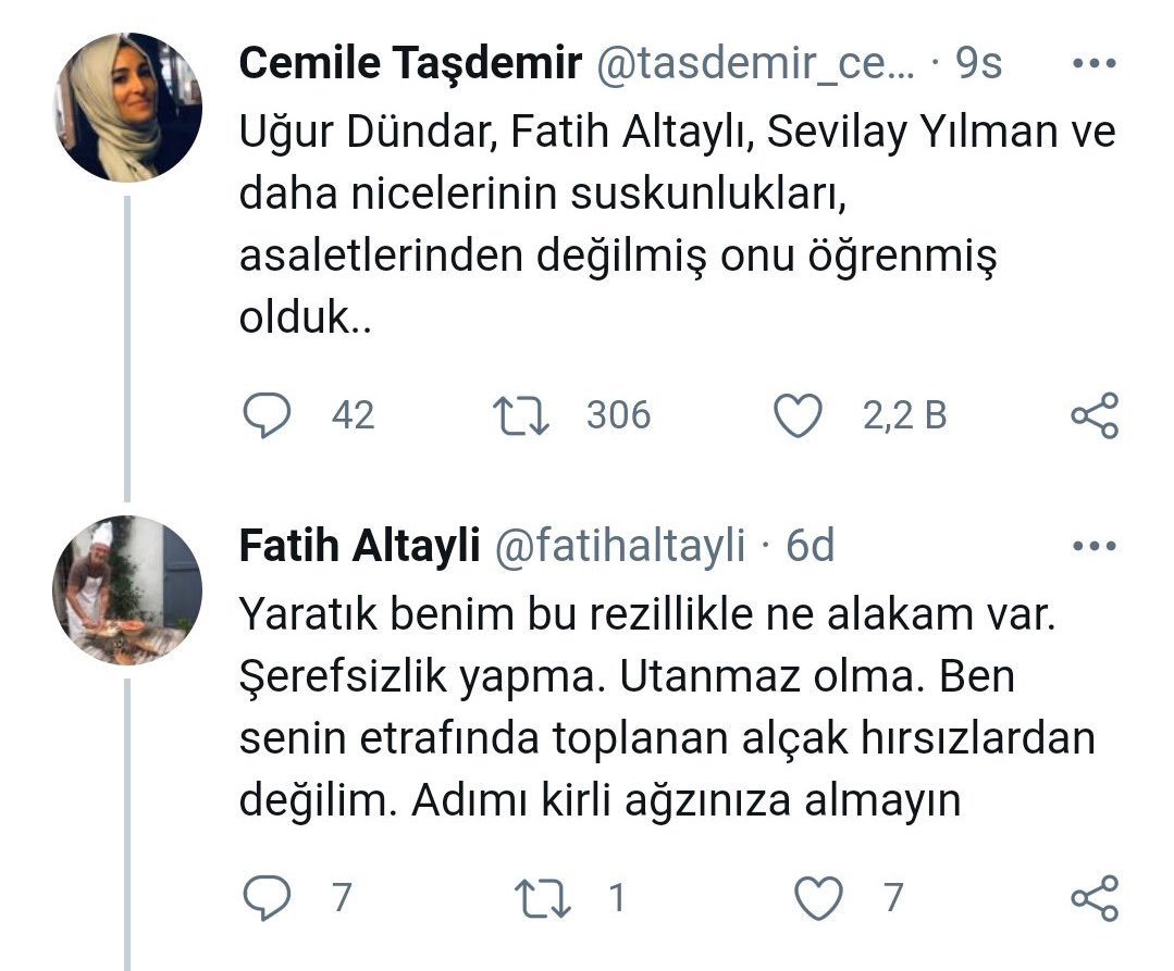 Gazeteci cemile taşdemir'in twitter hesabında ''uğur dündar, fatih altaylı, sevilay yılman ve daha nicelerinin suskunluğu asaletlerinden değilmiş onu öğrenmiş olduk.' ifadelerine yanıt veren fatih.